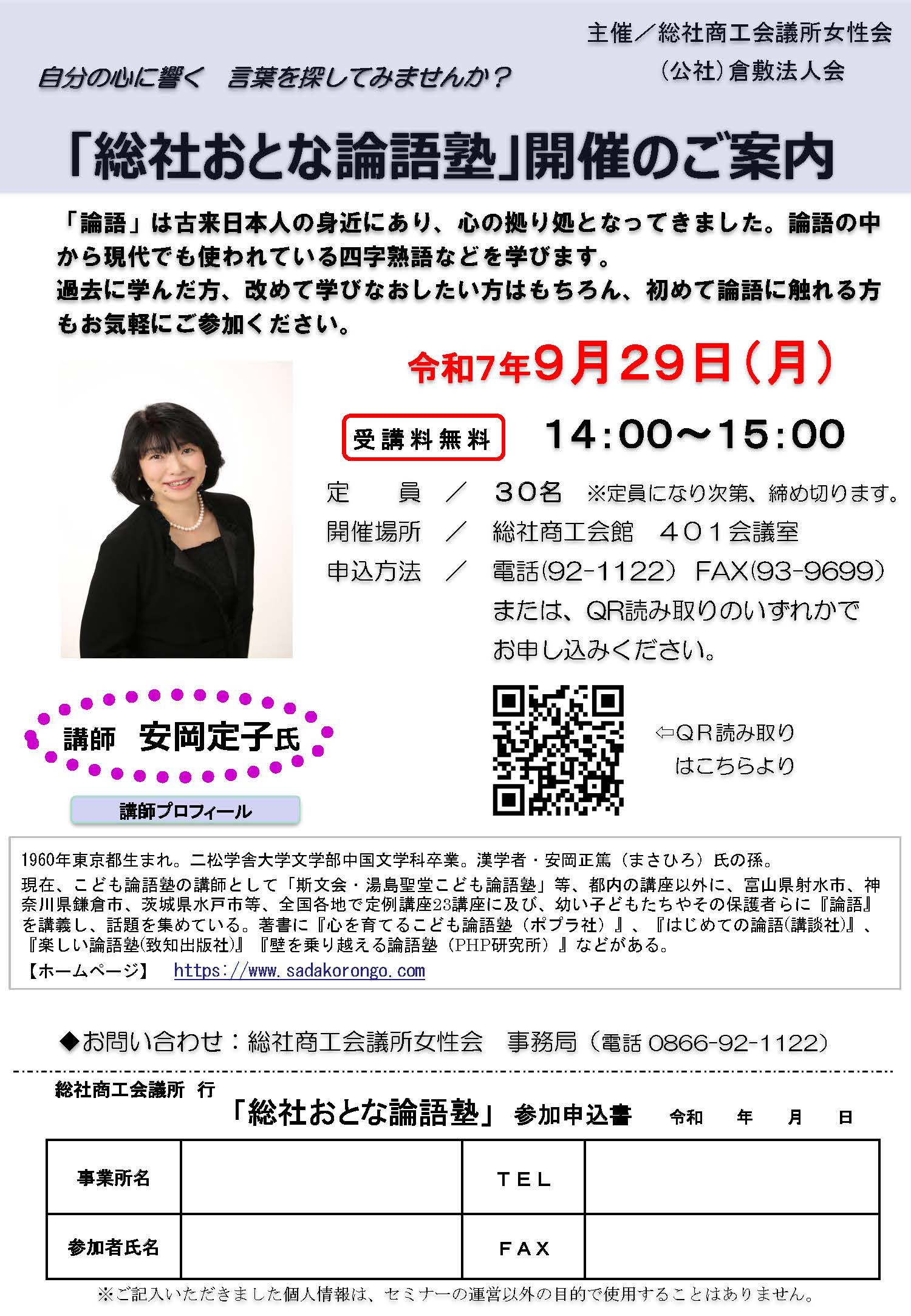 令和7年「総社おとな論語塾」開催のご案内 開催日時 2025年9月29日(月)14:00~15:00 会場 総社商工会館401会議室 参加費 無料 お申し込み方法 電話(92-1122)/FAX(93-9699)または、QR読み取りのいずれかでお申し込みください。